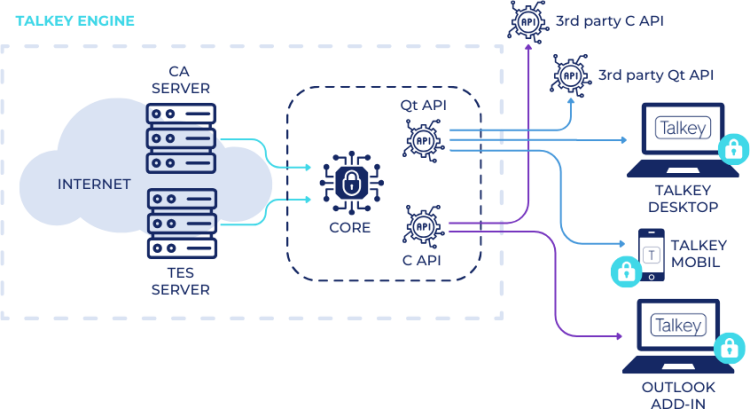 Talkey Engine umožňuje poskytovat informace a služby bezpečným, šifrovaným způsobem. Je navržen k integraci do aplikací a informačních systémů třetích stran. Zahrnuje šifrovací jádro, lokálně nainstalovanou knihovnu a CA server sloužící k uložení veřejných klíčů uživatelů a pro komunikaci mezi nimi.